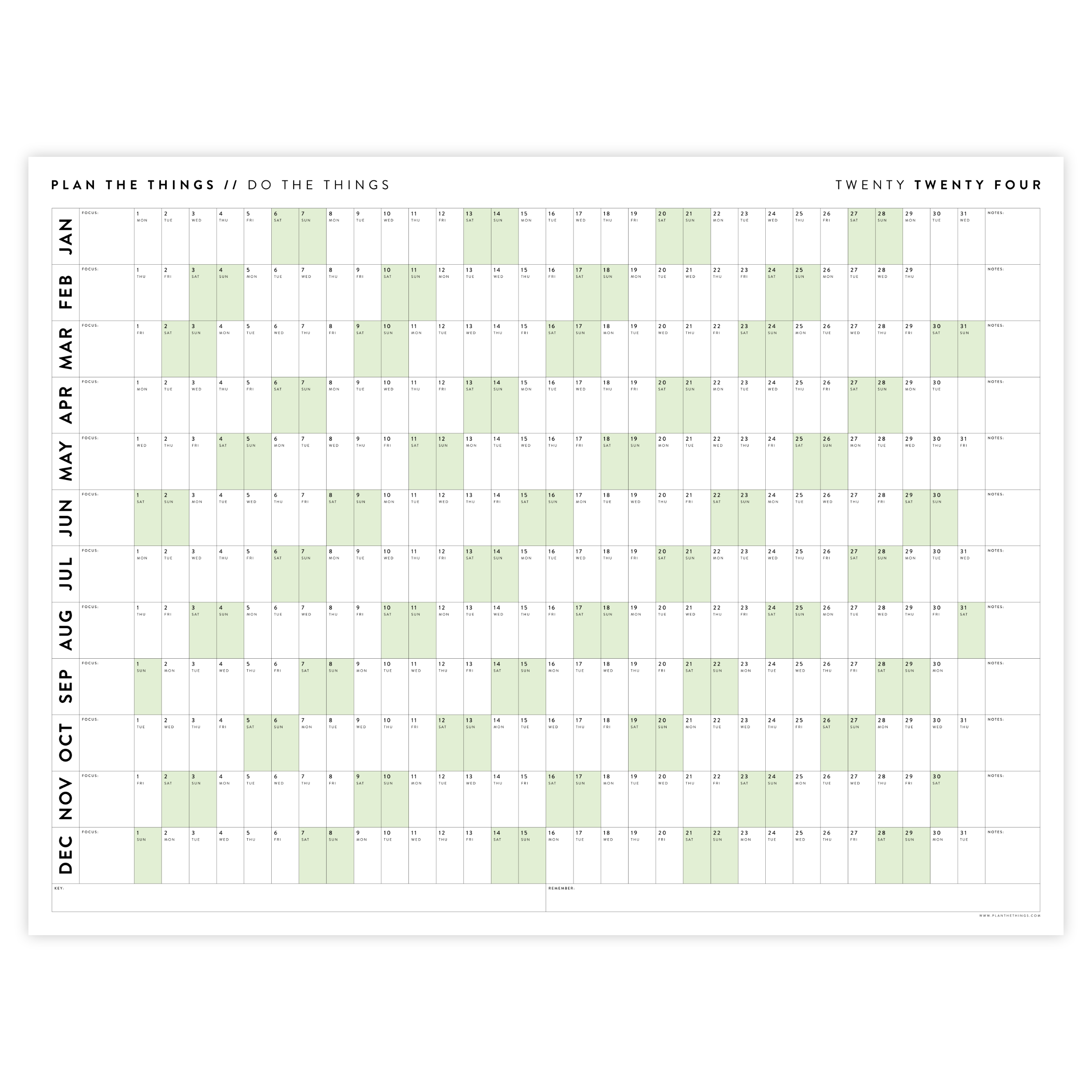 GIANT 2024 WALL CALENDAR | HORIZONTAL WITH GREEN WEEKENDS Plan